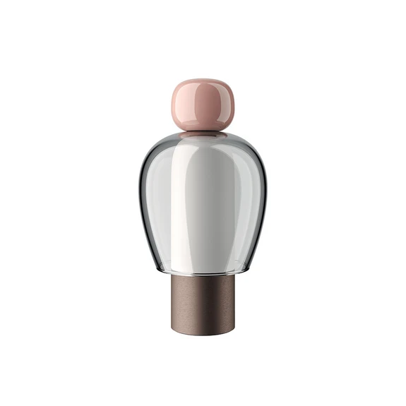Easy Peasy ToGo Bordlampe Flamingo Pink/Grey/Bronze er en skulpturel og transportabel bordlampe med en højde på 23 centimeter. Lampen har en base i metal, der indeholder en opal glasskærm, hvori den indbyggede LED er placeret. Hele lampen er pakket ind i en klokke i klar glas, der smukt filtrerer lyset. På lampens top sidder en knop, som drejes for at tænde og slukke lyset, samt dæmpe lysets intensitet.