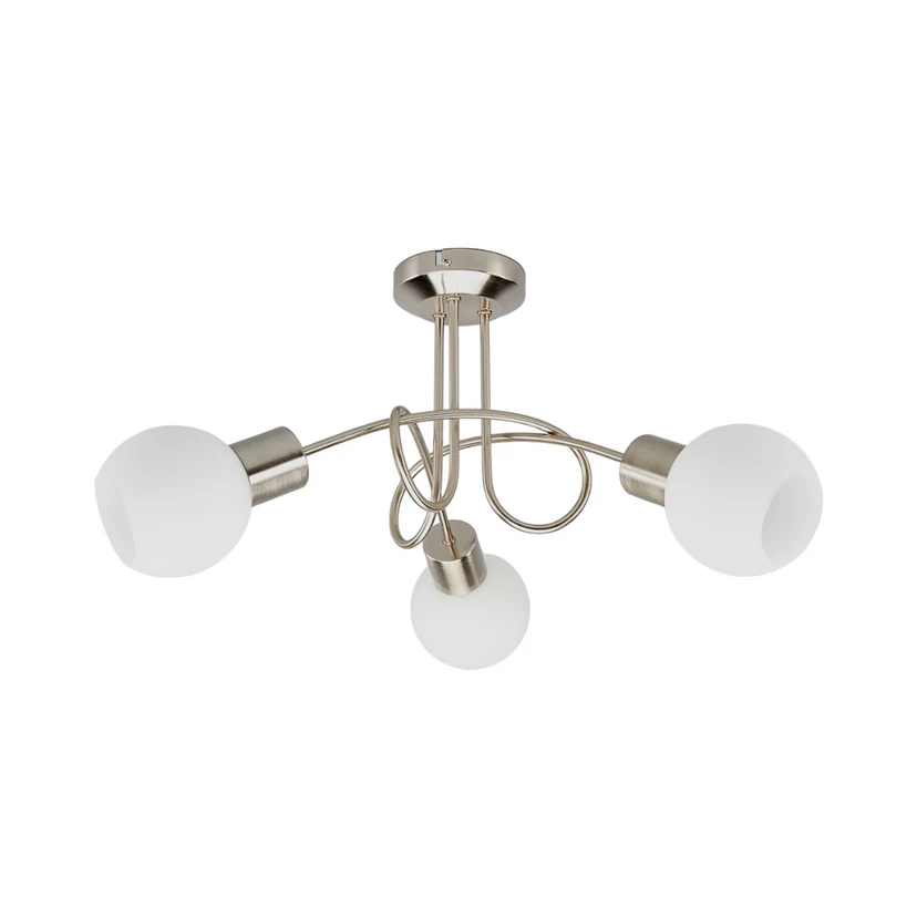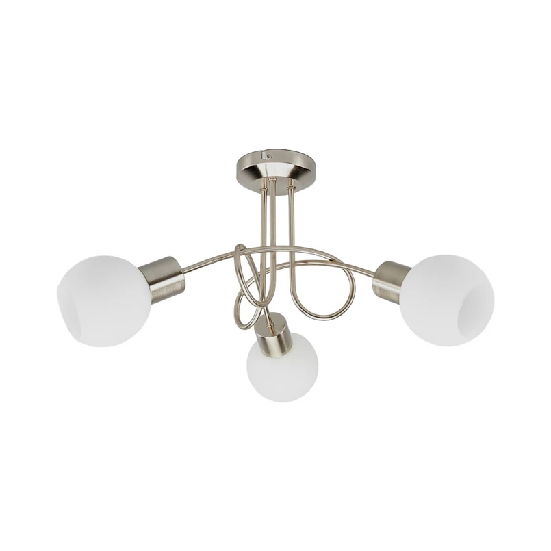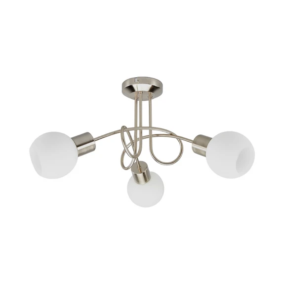 Elaina 3 Loftlampe Nickel/Opal er en skøn serie lamper med et sammenhængende udtryk. Alle lamper har den samme moderne fremtoning og samme enkle forening af metalstel og runde glasskærme. Skærmene har en lysudgang i bunden, så man får en direkte belysning. Da de samtidig er af glas, trænger lyset også igennem selve skærmen, som derfor lyser op hele vejen rundt. Glassets matte, hvide overflade muliggør en effektiv lysemission men i et blødt og blændfrit skær.