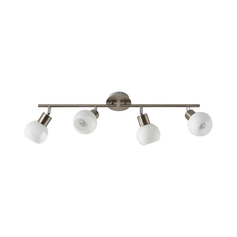 Elaina 4 Loftlampe Nickel præsenterer sig i et nydeligt design, der nemt finder en plads i stuen, på kontoret eller i soveværelset. Lampen består af et metalbeslag og -stel i en skinnende kvalitet samt fire smukke, runde glasskærme, der kunne minde om bærrene på et takstræ. Bag hver skærm sidder en udskiftelig LED-retrofitpære, der udsender et varmhvidt skær. Skærmenes matte, hvide overflade udjævner lyset og får det til at skinne blødt ud til alle sider.