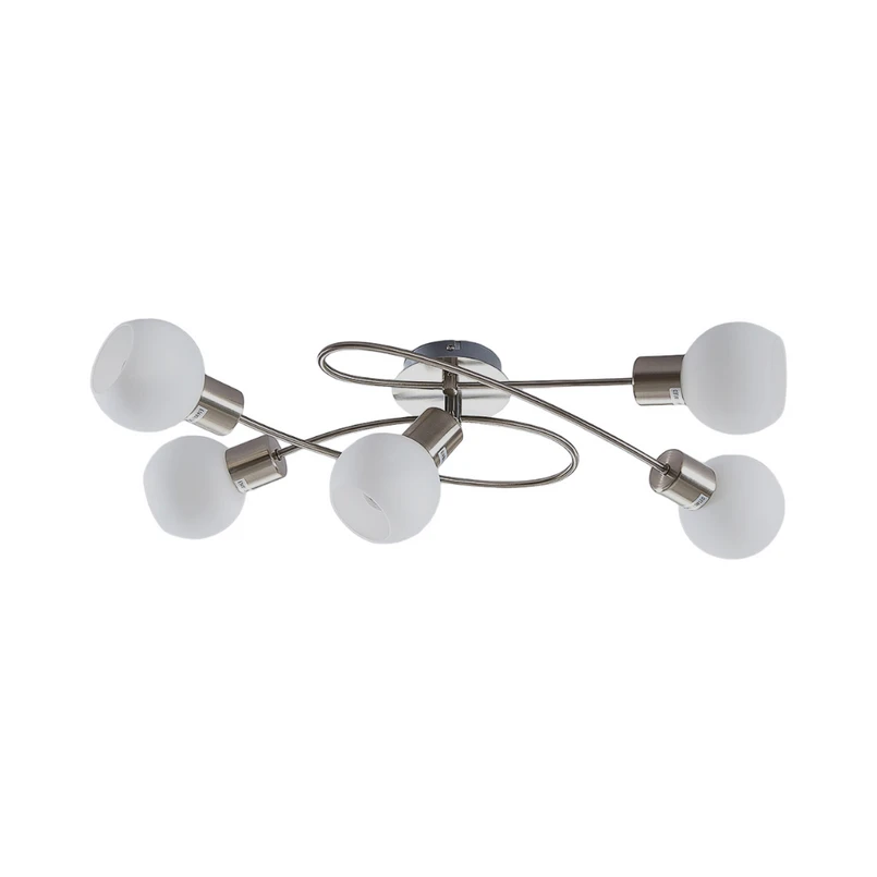 Elaina 5 LED Loftlampe Matt Nickel breder sine smukke buede lampehalse ud under loftet næsten som et organisk væsen. Den lækre metaloverflade kombineret med de elegante hvide lampeskærme giver lampen en super moderne udstråling. Samtidig breder de et flot og komfortabelt lys ud over rummet, mens de skaber en hyggelig og indbydende stemning.