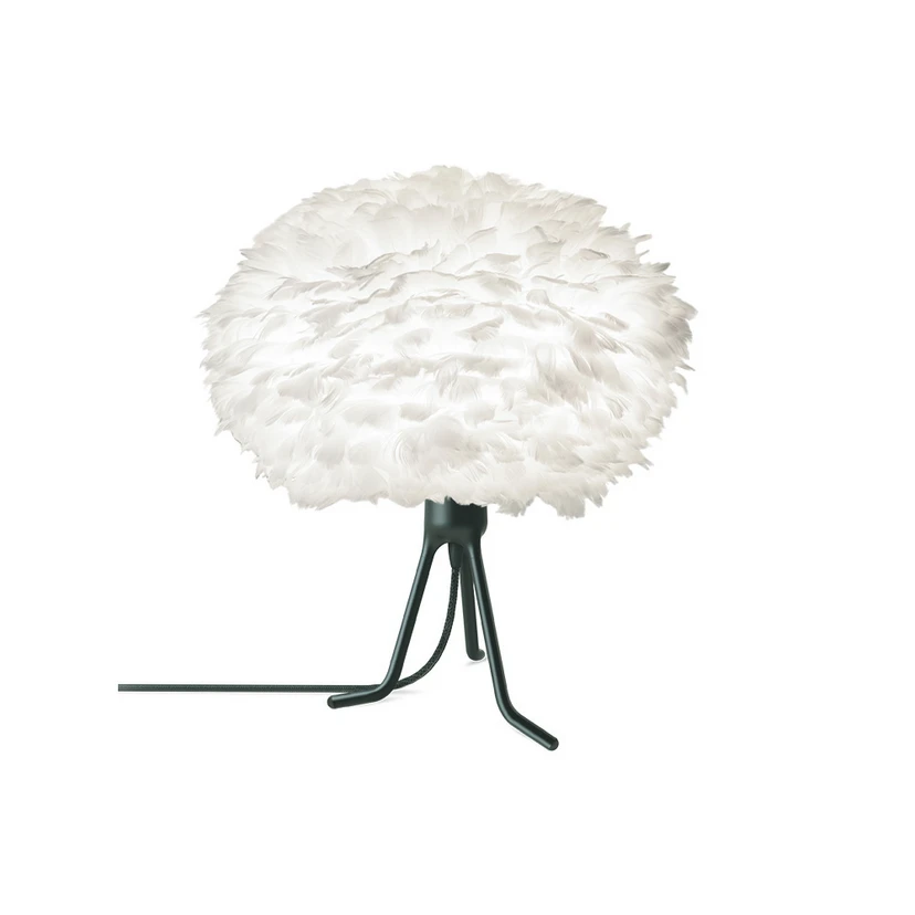 Eos Medium Bordlampe m/Mini Fod Hvid/Sort fra Umage er en helt unik lampe fremstillet i gåsefjer. Disse fjer sørger for at lyset strømmer blødt og lækkert fra lampen og selv når den ikke er tændt er den et kunstværk at se på.