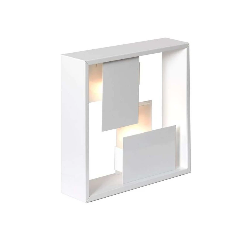 Fato T/W Bordlampe/Væglampe er et geometrisk design af firkantede metalskærme, der skaber et spændende spil mellem lys og skygge. Det hele er lukket inde i en firkantet ramme, så du får en skulpturel og dekorativ lampe, med stærke referencer til 60’ernes design. De foldede og svejsede plader rammer lyset ind og giver et behageligt og stemningsfyldt lys til omgivelserne.