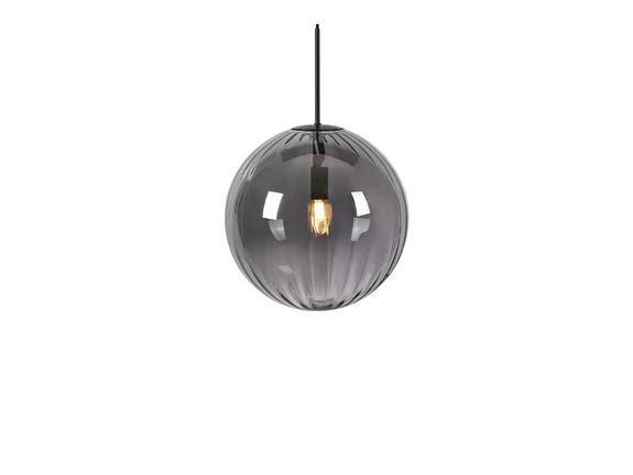 Fengari 1 Pendel Matt Black/Smoke er en stemningsfuld lyskilde med et behageligt skær og en iøjefaldende lyseffekt, der udgør et smukt highlight i indretningen, og som samtidig kommer i et enkelt og alsidigt design. Lampen er solidt sammensat af et diskret metalstel og en globeformet glasskærm med en flot farvetone, der sikrer lyset imod at virke skarpt eller skære i øjnene. Da glasset samtidig er transparent, kan lyset skinne direkte ud til alle sider i en harmonisk allround-belysning. Denne lystype kan både fungere over et spisebord, som grundbelysning i mindre rum og som supplerende belysning i større lokaler. Glasset har en særlig rillestruktur, der både tilføjer et individuelt udtryk til lampens visuelle fremtoning og samtidig skaber et smukt lysmønster over og under lampen.