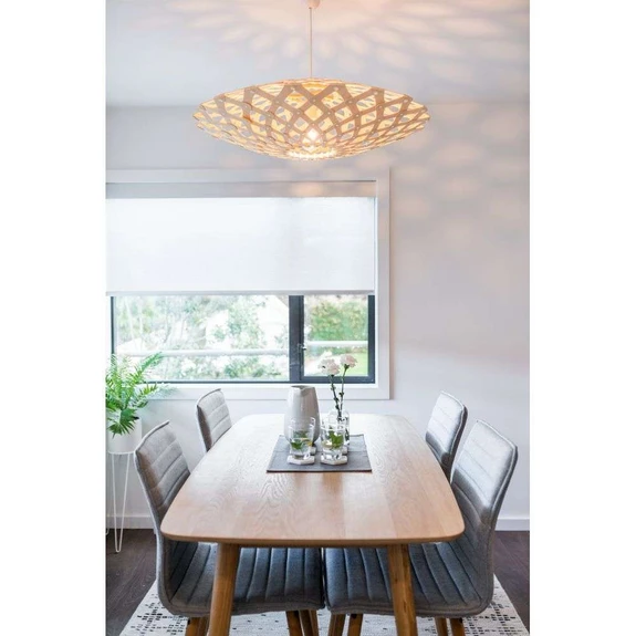 Flax Pendel Ø110 1 Side Sort fra David Trubridge er en elegant pendellampe, der bringer naturens skønhed ind i dit hjem. Inspireret af de lange, slanke blade fra den indfødte harakeke-flaxplante, kombinerer denne lampe traditionel maori-kultur med moderne design. Fremstillet af bambus krydsfiner og holdt sammen af nylonklemmer, tilbyder denne pendel en unik æstetik, der passer perfekt til både moderne og klassiske indretninger. Den sorte farve på den ene side giver en sofistikeret kontrast, der kan tilpasses både vertikalt og horisontalt, hvilket gør den ideel til rum med lavere lofter. Med en diameter på 110 cm er den en iøjnefaldende centerpiece, der skaber en varm og indbydende atmosfære. Uanset om du placerer den over spisebordet eller i stuen, vil Flax Pendel tilføje et strejf af naturlig elegance til dit hjem.