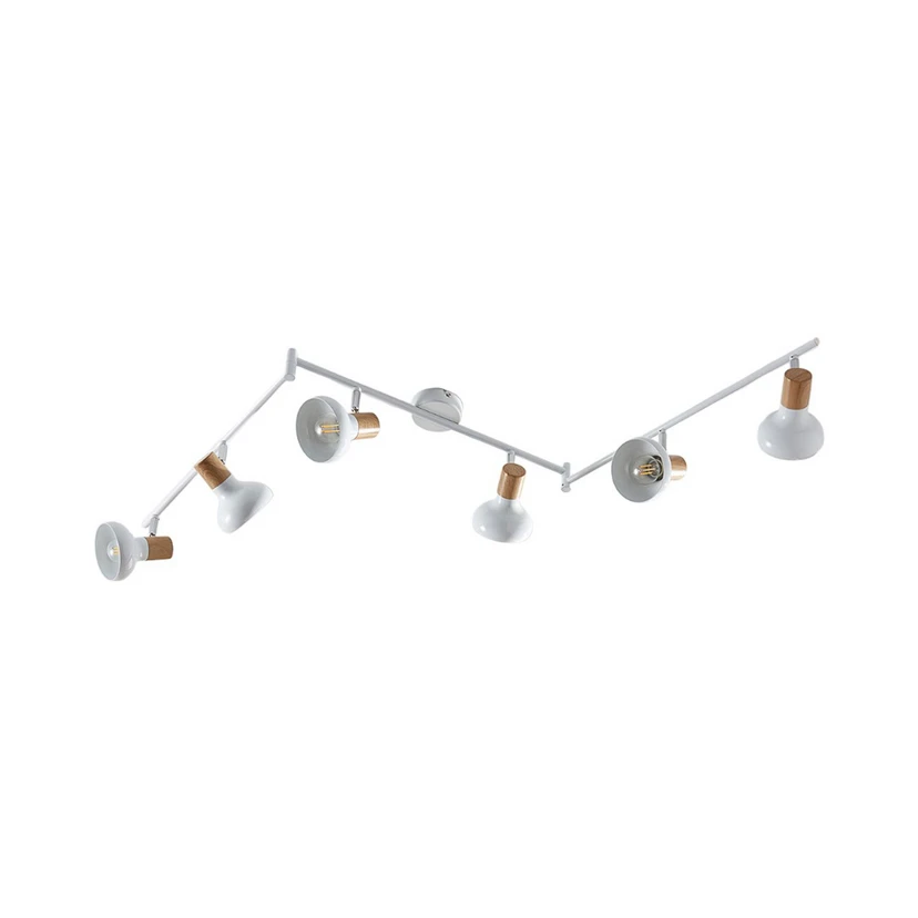 Lampen er sammensat af et tredelt stel og seks lyskilder. Skærmene har en hvid overflade, der matcher stellet, og har samtidig fine træelementer i toppen, der fremhæver det lyse, friske look og bidrager med et naturligt touch. Skærmene kan justeres individuelt, mens de to yderste dele af stellet kan drejes, så man kan justere lysretningen meget nøjagtigt. Derfor er Fridolin Loftlampe det oplagte valg til mange slags stuer, også dem med de mange kringelkroge, da lampen effektivt belyser hele rummet. Hver skærm dirigerer lyset direkte nedad i et effektivt skær, der egner sig godt som grundbelysning.