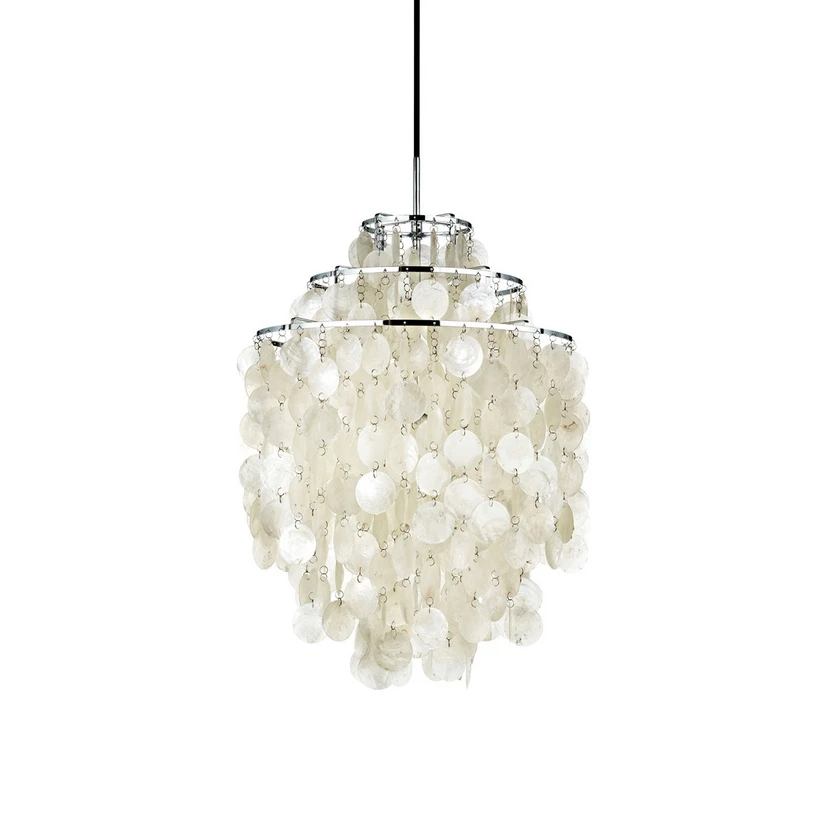 Lampen består af perlemorsskaller holdt sammen af metalringe, hvilket skaber en behagelig diffus spredning af lyset.