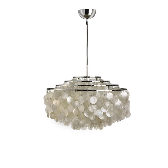 Lampen består af perlemorsskaller holdt sammen af metalringe, hvilket skaber en behagelig diffus spredning af lyset.