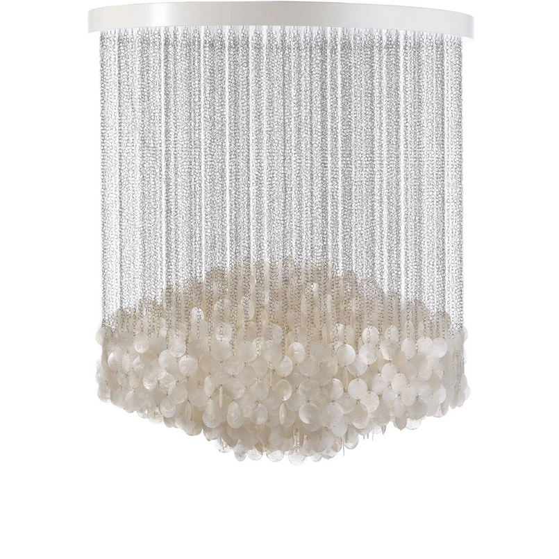 Lampen består af perlemorsskaller holdt sammen af metalringe, hvilket skaber en behagelig diffus spredning af lyset.