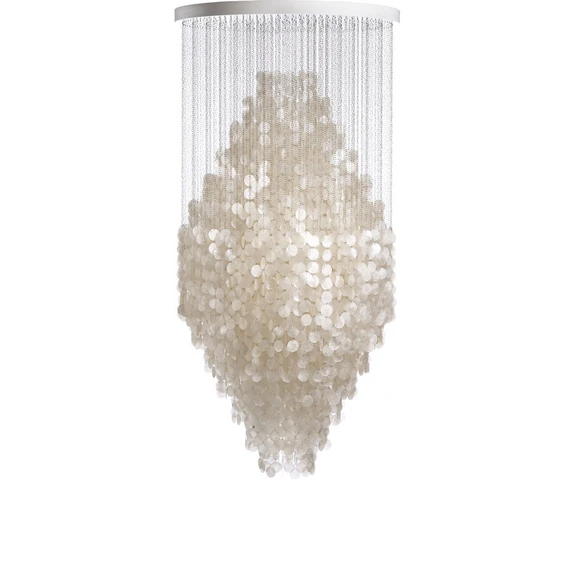 Lampen består af perlemorsskaller holdt sammen af metalringe, hvilket skaber en behagelig diffus spredning af lyset.