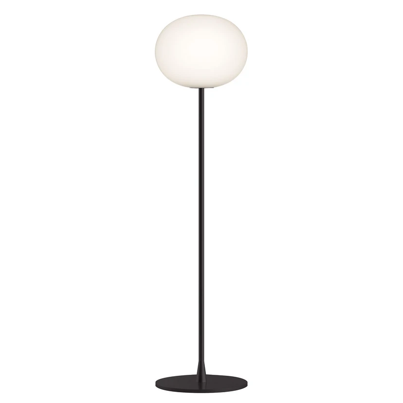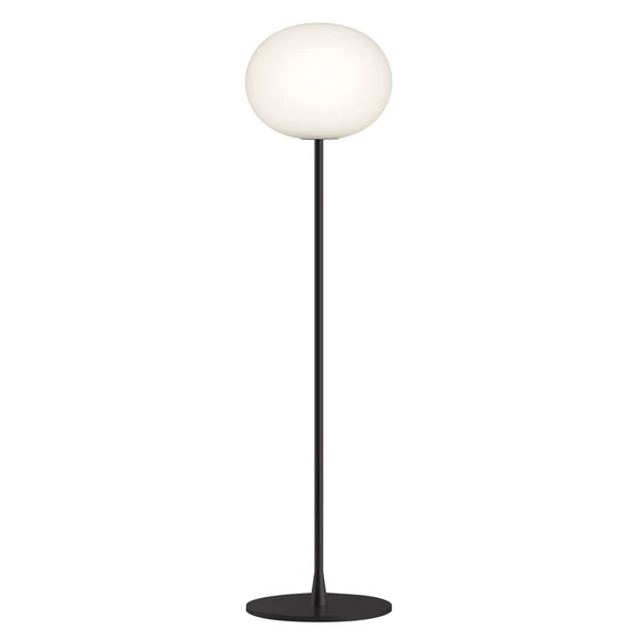Glo-Ball F1 Gulvlampe Black Opal er en del af Glo-ball serien fra Flos, hvor det simple design er bygget op omkring den simple glasskærm i mundblæst glas. Det matte opalglas giver et blødere lys end klar glas og er derfor helt ideel til at skabe en hyggelig belysning i hjemmet. Lampens klassiske udtryk og minimalistiske form, passer let ind i den moderne indretning, såvel som den klassiske.