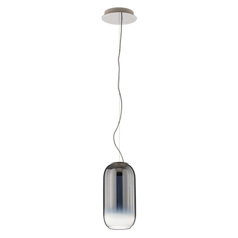 Gople Mini Pendel Silver er en spændende og innovativ lampe. Det smukke mundblæste glas, er lavet ved hjælp af en gammel venetiansk teknik, der gradvist forvandler glassets farve. Hver lampe er derfor helt unik i farve og kan variere en smule i form. Lampens simple form, fremhæver lampens smukke farvespil og den innovative finish.