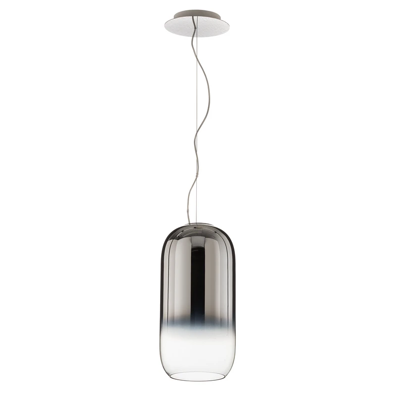 Gople Pendel Silver er en spændende og innovativ lampe. Det smukke mundblæste glas, er lavet ved hjælp af en gammel venetiansk teknik, der gradvist forvandler glassets farve. Hver lampe er derfor helt unik i farve og kan variere en smule i form. Lampens simple form, fremhæver lampens smukke farvespil og den innovative finish.