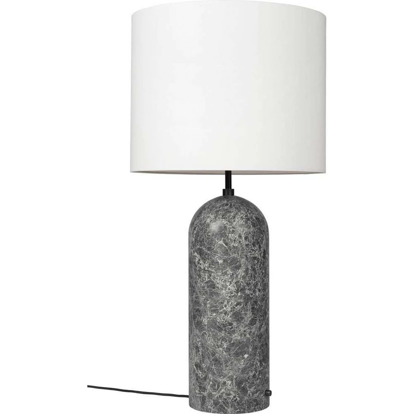Gravity XL Low Gulvlampe Grey Marble/White er designet med fokus på kontrasten mellem de to elementer; den tunge cylindriske base og den lette tekstilskærm. Kombinationen af de to, giver designet en perfekt balance – heraf også navnet ’Gravity’. Når lampen tændes sender den et diffust og stemningsgivende lys ud i omgivelserne, som bidrager til den hyggelige stemning.