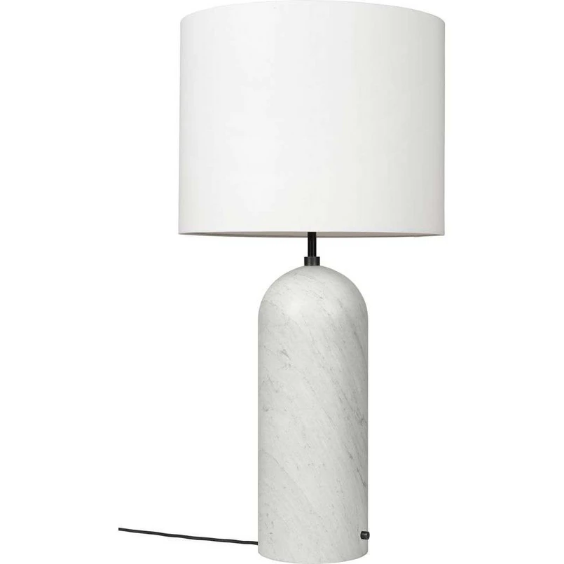 Gravity XL Low Gulvlampe White Marble/White er designet med fokus på kontrasten mellem de to elementer; den tunge cylindriske base og den lette tekstilskærm. Kombinationen af de to, giver designet en perfekt balance – heraf også navnet ’Gravity’. Når lampen tændes sender den et diffust og stemningsgivende lys ud i omgivelserne, som bidrager til den hyggelige stemning.