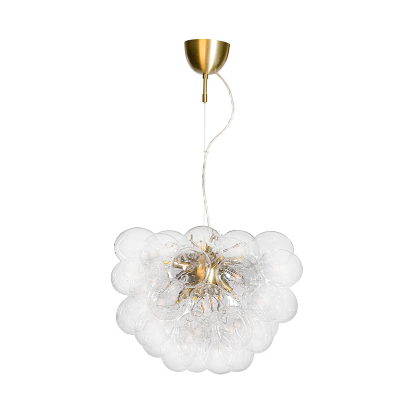 Gross Pendel Ø50 Messing/Klar fra By Rydéns er den perfekte tilføjelse til dit hjem, hvis du søger en pendel lampe, der kombinerer elegance og funktionalitet. Denne smukke pendel er fremstillet af metal og glas, og dens messingophæng giver et luksuriøst touch. Med 37 håndblæste, klare glaskugler skaber den en betagende lysfordeling, der tilføjer en klassisk atmosfære til ethvert rum. Pendlen har en imponerende diameter på 50 cm, hvilket gør den ideel til moderne indretninger, hvor den kan fungere som et centralt element. For at opnå den bedste belysning anbefales det at bruge 8 G9 LED-pærer med en maksimal effekt på 8W. Uanset om du placerer den i stuen, spisestuen eller entréen, vil Gross pendel bringe en tidløs charme og stil ind i dit hjem.