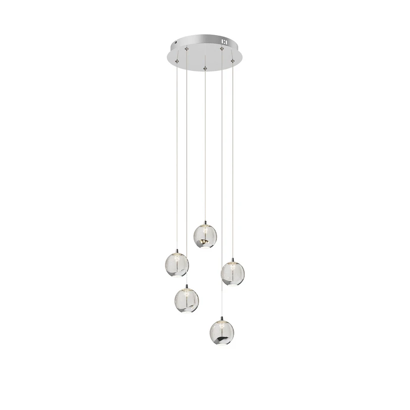 Hayley 5 Pendel Clear/Chrome vil med sine smukke og elegante buede silhuet tage sig godt ud i næsten ethvert lokale. Især som det samlende element i stuen, ophængt parvis over spisebordet eller måske endda i entréen vil den komme til sin ret. Det lækre varme lys bølger ud fra lyskilderne og forkæler øjnet, mens lokalet får en stilet og fængende æstetik.