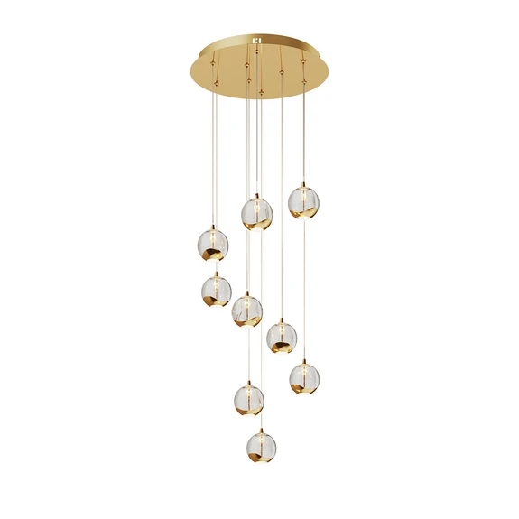 Hayley 9 Pendel Clear/Gold har et fortryllende udtryk med sin harmoniske konstellation af glaskugler, der danner en dekorativ klynge af lys. Med Hayley får man ikke kun belysning. Man får også et smukt stykke designkunst, som beriger rummet med helt særlig atmosfærisk stemning, der passer til privathjemmet såvel som til cafeen eller hotellet.