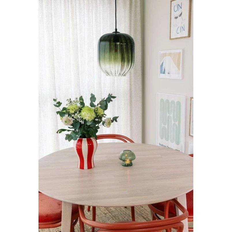 Haze Pendel 18 Green fra Globen Lighting er en elegant pendellampe, der vil tilføje et strejf af moderne stil til dit hjem. Denne smukke lampe er fremstillet af håndblæst glas, der er ribbet på indersiden, hvilket skaber et fascinerende spil af lys og skygge. Det grønne glas kombineres med sorte metaldele, hvilket giver lampen et moderne og stilfuldt udtryk. Haze pendellampen er udstyret med en 120 cm lang sort tekstilkabel og en matchende metal loftkop, der sikrer en harmonisk ophængning. For at sikre, at lampen hænger lige, kan det være nødvendigt at justere ophængningspunktet. Da glasset er håndblæst, kan der være variationer i tykkelse og farve, hvilket gør hver lampe unik. Denne pendellampe er perfekt til at skabe en hyggelig atmosfære i stuen, over spisebordet eller i entréen. .