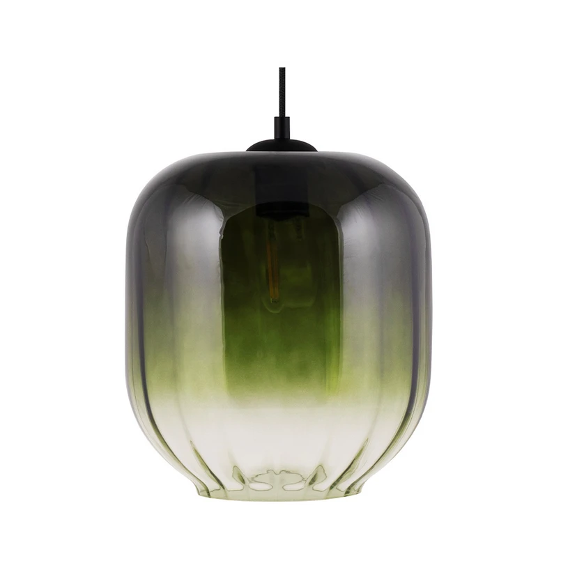 Haze Pendel 25 Green fra Globen Lighting er en elegant pendellampe, der tilføjer et strejf af moderne design til dit hjem. Denne smukke lampe er fremstillet af håndblæst glas, som er ribbet på indersiden, hvilket skaber et fascinerende lysspil, når lampen er tændt. Det grønne glas kombineres med sorte metaldetaljer, der giver lampen et stilfuldt og nutidigt udtryk. Med en 120 cm lang sort tekstilkabel og en matchende metal loftkop, er Haze både funktionel og æstetisk tiltalende. For at sikre, at lampen hænger lige, kan det være nødvendigt at justere ophængets placering. Da glasset er håndblæst, kan der være variationer i tykkelse og farve, hvilket gør hver lampe unik. Haze pendellampen er perfekt til at skabe en hyggelig atmosfære i stuen, over spisebordet eller i entréen. .
