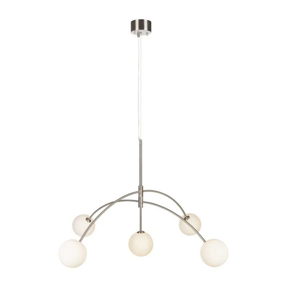 Heaven 5 Pendel Stål/Opal fra Markslöjd er den ideelle pendellampe til dig, der ønsker at tilføre et rum en unik atmosfære. Denne imponerende pendel, designet af Joakim Thedin, er skabt til at være rummets naturlige midtpunkt med sin fantastiske lysfordeling. Med en diameter på 117 cm er Heaven 5 både stor og iøjnefaldende, hvilket gør den perfekt til større rum, hvor den kan sprede sit bløde, opale lys. Lampen er fremstillet i jern og glas, hvilket giver den en elegant kombination af sølv og opal farver, der passer ind i mange forskellige indretningsstile. Heaven 5 kræver fem G9 pærer med en maksimal effekt på 28W eller tilsvarende i LED, som ikke medfølger. Denne pendellampe er ikke kun en lyskilde, men også et kunstværk, der tilføjer stil og elegance til dit hjem.