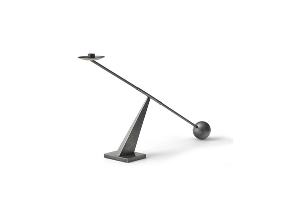 Designet imiterer en antik vægt men erstatter vægtskålene med en lyseholder i den ene ende og en kugle i den anden. Kuglens kompakte og tunge komposition løfter holderen op, så den kommer i fokus, hvilket kun fremhæves yderligere, når man bestykker holderen med et stearinlys. Lysestagen er forholdsvis stor og kan derfor med fordel placeres på et konsolbord eller i en dyb vindueskarm.