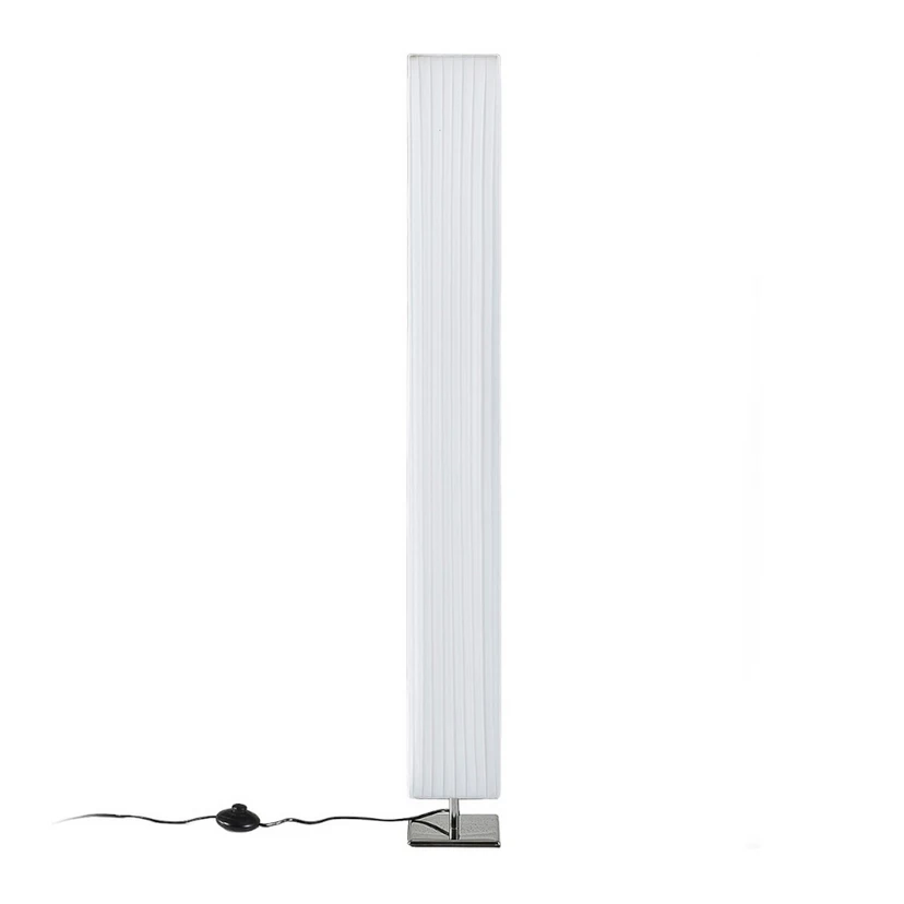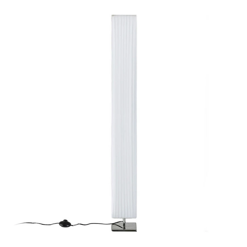 Janno Gulvlampe White/Chrome løfter sig som en antik søjle med sin imponerende, ranke statur og harmoniske, detaljereducerede form. Lampen er sammensat af en kvadratisk fod med en skinnende kromfarvet overfladefinish og en rektangulær lampekrop, der både udgør stel og skærm. Lampen er betrukket med hvidt tekstil og kan derfor nemt indpasses uanset indretningsstil. Tekstilet har en rillet overflade, der minder om kannelurer og fremhæver det karakteristiske søjle-look.