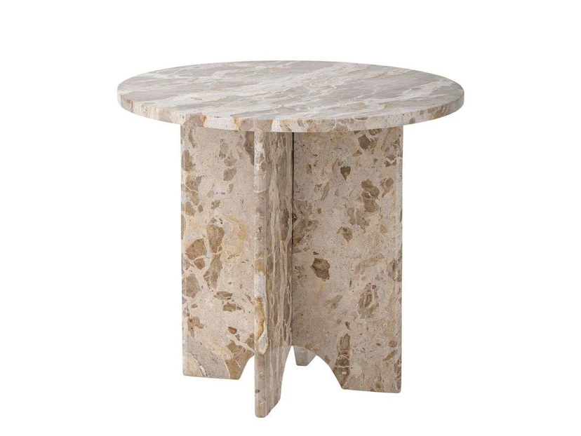 Jasmia Side Table Brown Marble præsenterer sig i et luksuriøst design med et eksklusivt udtryk, der bringer stilfuldhed og en forfinet æstetik ind i indretningen. Det lille konsolbord er kendetegnet ved en harmonisk sammensætning af geometriske former, både ved den cirkulære bordplade og ved de fire rektangulære ben, der krydser over på midten, og skaber en struktur, der både er slank og kompakt, yndefuld og holdbar på en og samme tid. Bordet er udført i ægte marmor, der slebet i alle ender og kanter, så de smukke, naturlige overflademønstre kommer tydeligt til udtryk. Da marmor er en natursten, vil der forekomme individuelle variationer, som gør hvert Jasmia-bord til et unikum.