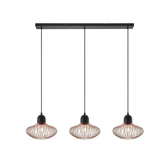 Justinos 3 Pendel Black/Copper er en stilfuld tilføjelse til spisebordet, køkkendisken eller andre områder med behov for praktisk belysning med bred omkreds. Lampens tre skærme er udformet i et trendy bur-design, der består af bøjede metalstave arrangeret rundt om lyskilden, så de danner en flot figur.