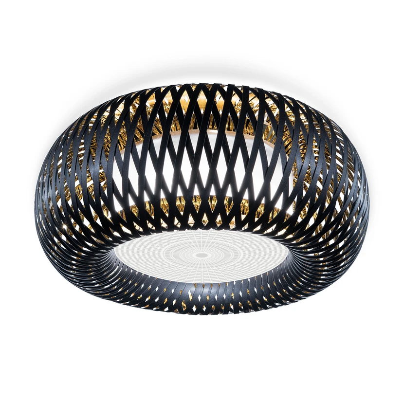 Kalatos Loftlampe/Væglampe Black/Gold er inspireret af vævningskunst fra forhistorisk tid og har fået sin form fra kurve og sække til sukkerrør. Ved at kombinere vævningskunsten med SLAMPs avancerede teknopolymere, har designeren skabt en iøjefaldende lampe et moderne udtryk.