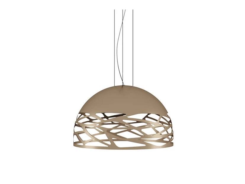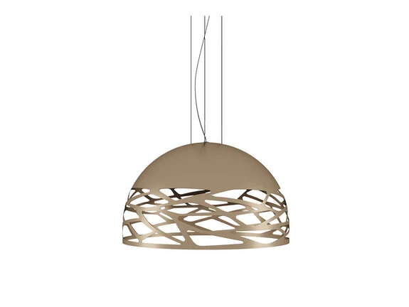 Kelly Dome Pendel Ø60 Matt Golden er endnu en smuk tilføjelse til den unikke lampeserie Kelly af den italienske designer Lodes. Kelly-serien er karakteriseret ved deres formfuldendte sfæriske lampeskærme med smukke forgreninger i bunden, der skaber et smukt og spændende lysspil, hver gang lampen er tændt. Skærmen er skåret med en særlig laserteknik med millimeter-præcise snit, der skaber et smukt lysbillede og giver lampen en knivskarp stringens, der vidner om et gennemtænkt design. Forgreningernes bevidst uregelmæssige struktur tilføjer et organisk udtryk til lampens design og lader samtidig lyset trænge ud igennem de mange mellemrum, så der skabes et bredt lysbillede, der samtidig fremhæver lampens formsprog.