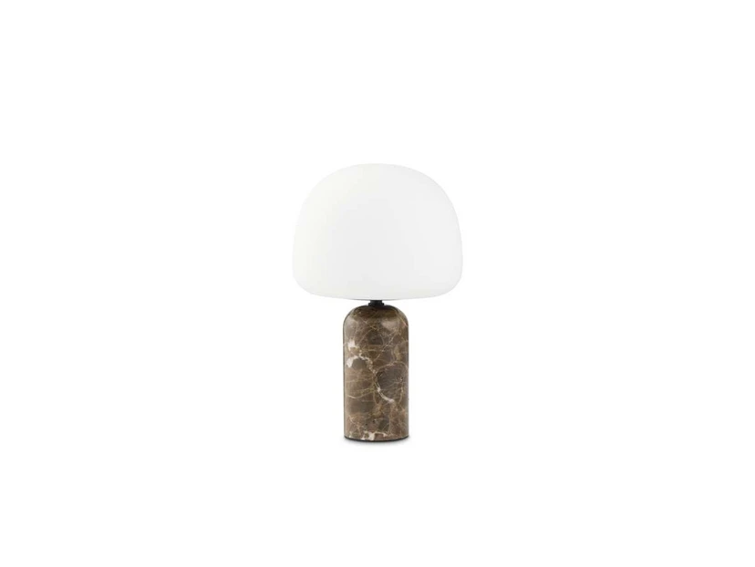 Kin Bordlampe H33 Brown Marble præsenterer sig i et minimalistisk design, der er perfekt egnet til alle indretninger med forkærlighed for nordisk stil. Lampen består af en base i brunt marmor og en kuplet skærm i hvidt opalglas. Basens smukke naturmateriale sikrer, at hvert eksemplar af lampen er unikt, så man med hver Kin Bordlampe har et individuelt stykke designkunst til at forskønne sin personlige stil.