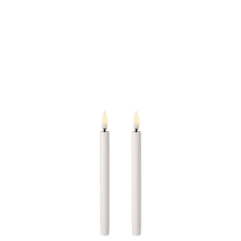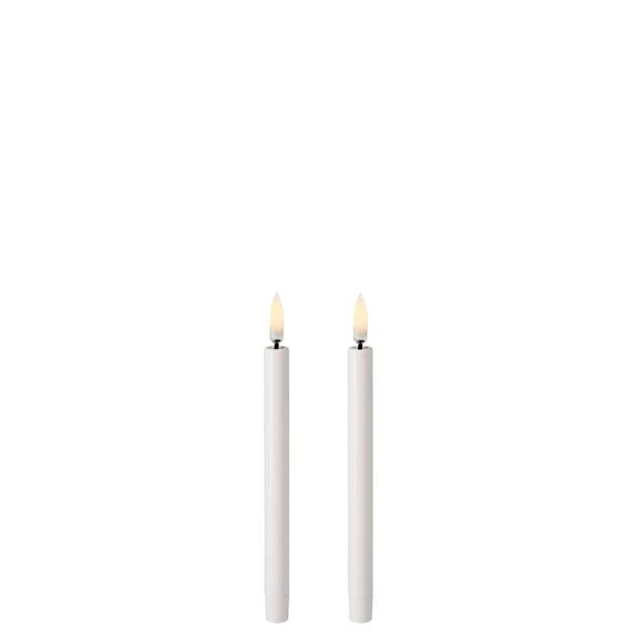 Kronelys Mini LED Nordic White 2 pcs 1,3 x 13 cm har en unik 3D flamme, der til forveksling ligner flammen fra et traditionelt stearinlys. Takket være LED-teknologien, har Uyuni Lighting skabt en serie af LED stearinlys, der ligner en levende flamme, der står og blafre let. Flammen har ingen fysisk bevægelse og du slipper derved for, at bruge strøm på at holde bevægelsen i gang.