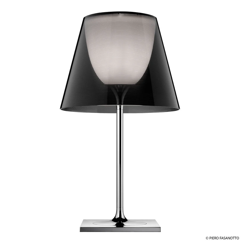 Som selv sagde, da han præsenterede KTribe serien:” Man kan aldrig lade to Miss K lamper stå alene sammen. Så formerer de sig bare”. Og det gjorde de så, men i en lidt anderledes udgave. Skærmen er stadig det samme med pådampet aluminium på indersiden af skærmen, og den opale inder skærm der giver det hvide diffuse lys.Krom base m. 4-trins lysdæmper. KTribe T2 Bordlampe fås i skærmfarverne: Silver, transparent, bronze, smoke eller råhvid silke, og KTribe T1 i transparant og smoke.