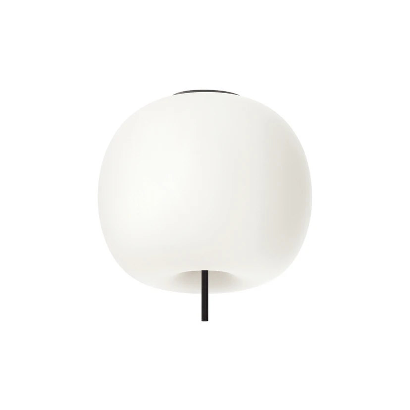 Kushi Loftlampe Black er kendetegnet ved sin organiske form og behagelige belysning, der tilsammen udstråler ro og komfort. Lampen består først og fremmest af en massiv skærm i mundblæst glas, der udsender et rart, diffust og blændfrit lys. Skærmens svulmende form kontrasteres smukt af det tynde stel, hvilket giver lampen en karakteristisk æble-agtig æstetik.