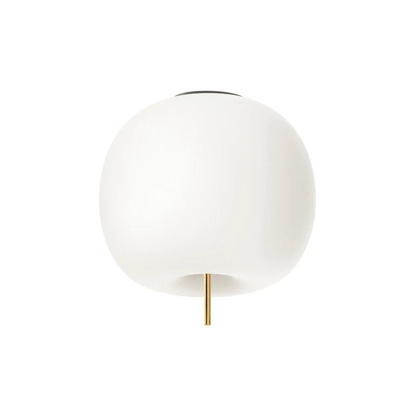 Kushi Loftlampe Brass er kendetegnet ved sin organiske form og behagelige belysning, der tilsammen udstråler ro og komfort. Lampen består først og fremmest af en massiv skærm i mundblæst glas, der udsender et rart, diffust og blændfrit lys. Skærmens svulmende form kontrasteres smukt af det tynde stel, hvilket giver lampen en karakteristisk æble-agtig æstetik.