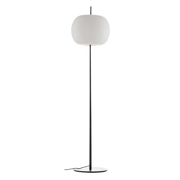 Kushi Gulvlampe XL Black er kendetegnet ved sit elegante formsprog, der udmønter sig i den slående, men harmoniske kontrast mellem stel og skærm. Det høje, slanke stel i farvet metal modsvares af en svulmende skærm med en blød, rund form i farverent glas. Dette design får lampen til at minde om en bomuldskvist og giver den et organisk præg.