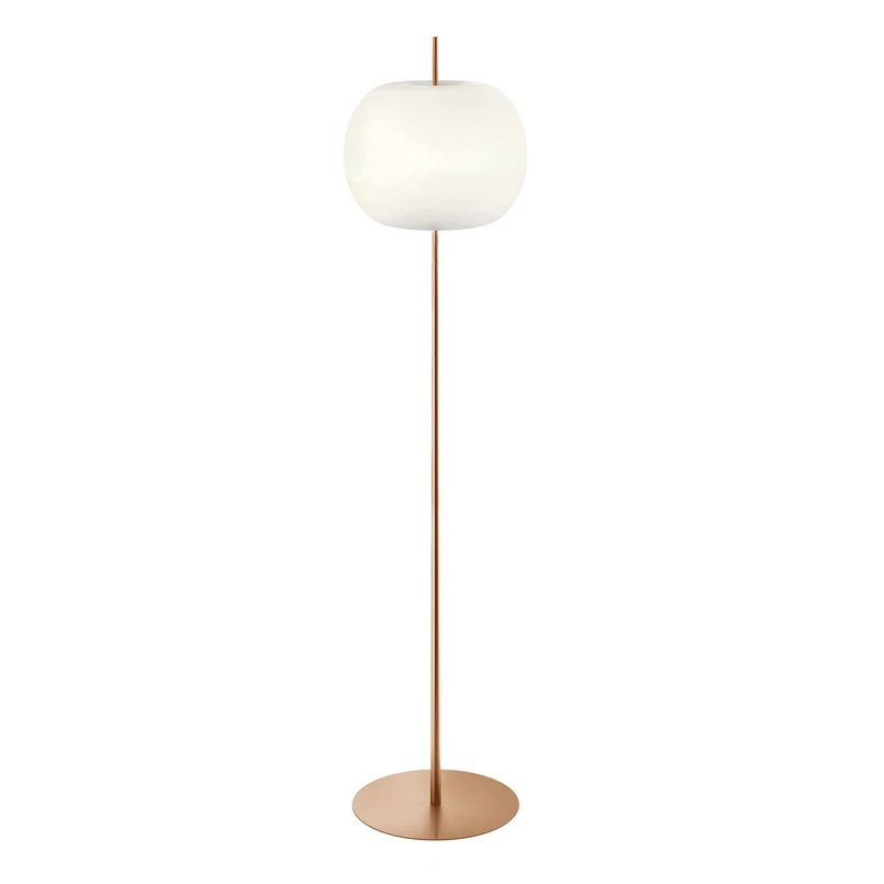 Kushi Gulvlampe XL Copper er kendetegnet ved sit elegante formsprog, der udmønter sig i den slående, men harmoniske kontrast mellem stel og skærm. Det høje, slanke stel i farvet metal modsvares af en svulmende skærm med en blød, rund form i farverent glas. Dette design får lampen til at minde om en bomuldskvist og giver den et organisk præg.