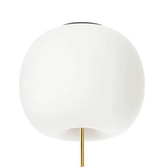 Kushi XL Loftlampe Brass er kendetegnet ved sin organiske form og behagelige belysning, der tilsammen udstråler ro og komfort. Lampen består først og fremmest af en massiv skærm i mundblæst glas, der udsender et rart, diffust og blændfrit lys. Skærmens svulmende form kontrasteres smukt af det tynde stel, hvilket giver lampen en karakteristisk æble-agtig æstetik.