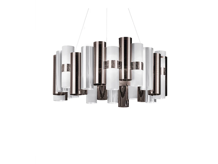 La Lollo Pendel L Pewter fra SLAMP er en elegant pendellampe, der bringer en snert af 50'ernes glamour ind i dit hjem. Designet af Lorenza Bozzoli, er denne lampe en hyldest til en tid præget af retro charme og stil. Pendlen består af en række lette og uknuselige cylindre i Lentiflex®, der er arrangeret omkring en LED-integreret central ring. Dette materiale, kombineret med kold folie, giver lampen en unik grå nuance, der tilføjer et dramatisk og opulent touch til ethvert rum. La Lollo Pendel er ikke kun en lyskilde, men også et kunstværk, der kan tilpasses i både farve og størrelse efter dine ønsker, hvilket gør den ideel til større installationer. Uanset om du ønsker at oplyse din stue eller skabe en stemningsfuld atmosfære i spisestuen, vil denne pendellampe være et perfekt valg.