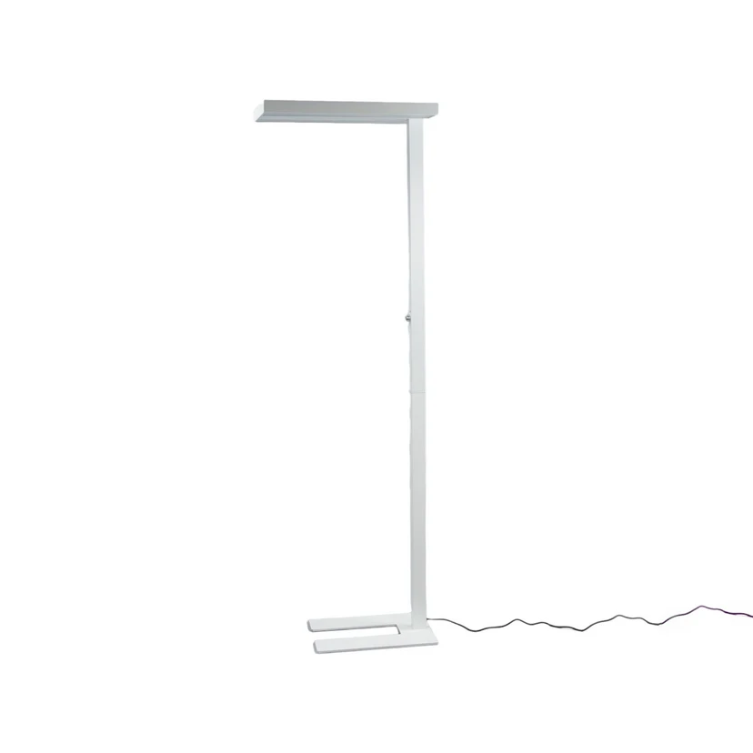Logan Gulvlampe White er indrettet med særligt henblik på at skabe de optimale forhold til arbejde og længere tids koncentration. Både i form og funktion er denne model den oplagte kontorlampe og kan takket være sit enkle design integreres fint på arbejdspladsen såvel som i studerekammeret derhjemme. Lampen har en funktionel form med en U-formet fod, der gør den nem at manøvrere omkring bordben, et 2 meter langt stel, der sikrer lampehovedet imod at stå i vejen, og et fladt lampehoved, der giver et godt, bredt lysindfald. De indbyggede LED’er skinner ud i et praktisk nedadrettet skær.