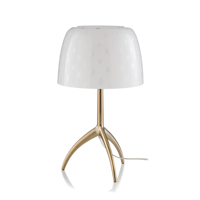 Lumiere Grande 30th Bordlampe Golden/Bulles Dimm. er en unik bordlampe fra det anerkendte mærke Foscarini. Denne specialudgave fejrer 30-års jubilæet for en designklassiker, der har prydet mange hjem med sin tidløse elegance. Bordlampen kombinerer glas og aluminium i en smuk opal og gylden farve, hvilket giver et moderne og stilfuldt udtryk. For første gang nogensinde er overfladedekorationen på det mundblæste glas blevet tredimensionel, hvilket tilføjer en ny dimension til det klassiske design.
