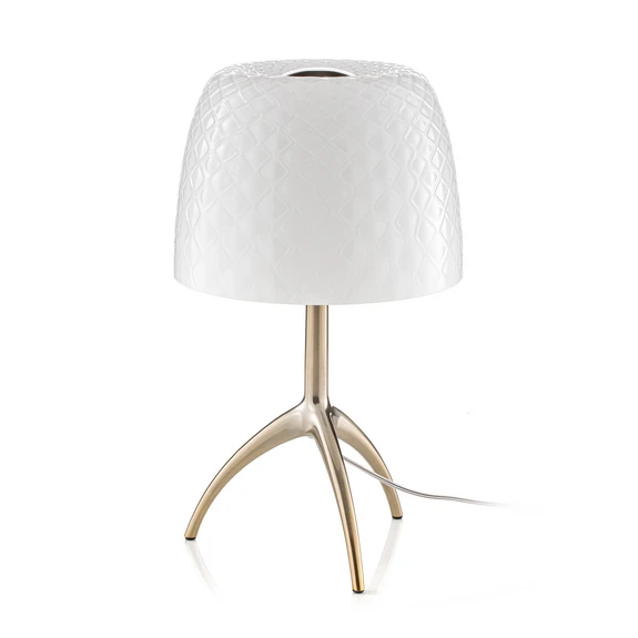 Lumiere Grande 30th Bordlampe Golden/Pastilles On/Off er en unik bordlampe fra det anerkendte mærke Foscarini. Denne specialudgave fejrer 30-års jubilæet for en designklassiker, der har prydet mange hjem med sin tidløse elegance. Bordlampen kombinerer glas og aluminium i en smuk opal og gylden farve, hvilket giver et moderne og stilfuldt udtryk. For første gang nogensinde er overfladedekorationen på det mundblæste glas blevet tredimensionel, hvilket tilføjer en ny dimension til det klassiske design.