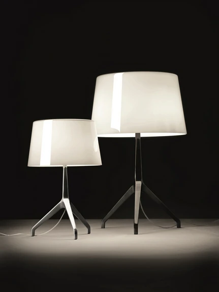 Lumiere XXL Bordlampe Alu/Hvid er et glimrende eksempel på vellykket design. Siden Lumiere-serien blev tegnet af den italienske designer Rodolfo Dordoni tilbage i 1990, har lampen været en af de mest solgte lamper i Foscarinis sortiment, hvilket både skyldes den heldige sammenblanding af klassiske og stilrene udtryk, og det eksklusive materialevalg, der ligger til grund for lampen. Skærmen er fremstillet af mundblæst glas. Man er dermed sikret et håndlavet produkt, der er helt sit eget, i og med at enkelte variationer forekommer fra lampe til lampe. Indersiden af skærmen er hvidlakeret, så lyset reflekteres effektivt og fremstår endnu klarere, når lampen tændes, mens ydersiden kommer i flere flotte farvevarianter. Lumiere-serien omfatter både gulv- og bordlamper. Disse kommer i forskellige udgaver med kantede eller let afrundede skærme, og der fås sågar reserveskærme, så man kan variere mellem flere forskellige farver.