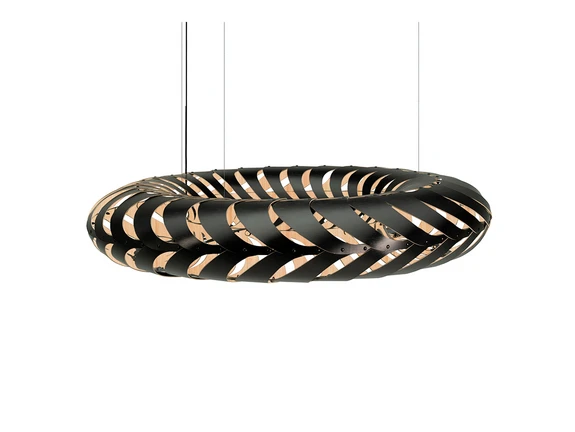 Maru Pendel Ø140 Sort 1 Side fra David Trubridge er en unik pendel, der kombinerer kunst og funktionalitet. Denne imponerende lampe er fremstillet af bæredygtig bambus og har en elegant sort finish, der passer perfekt ind i moderne indretninger. Med en højde på 25 cm og en diameter på 140 cm er Maru en iøjnefaldende belysningsskulptur, der tilføjer et strejf af elegance til ethvert rum. Det særlige ved Maru er det kalejdoskopiske lysmønster, som den kaster opad, inspireret af diatomernes form, der symboliserer livets cyklus. Udstyret med seks indbyggede Lumiled LED'er, skaber den en fascinerende overlapning af lys, der kan forvandle atmosfæren i en bar, lounge eller restaurant. Maru er ikke kun en lyskilde, men også et kunstværk, der kan komplementere andre lyskilder eller stå alene som et stemningsfuldt blikfang.