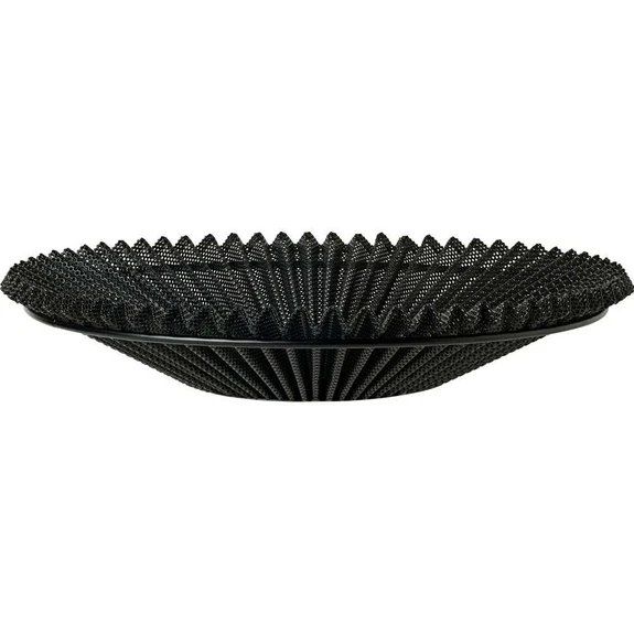 Planen er bukket, og snoet til at forme en skål, som bliver holdt sammen af en tynd metaltråd. Hele skålen er lakeret, og har et helt rent og minimalistisk udtryk, der tangerer det industrielle, når den ligger på sofabordet, en hylde eller kommode.