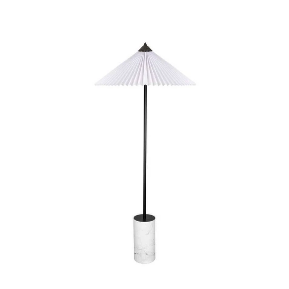 Pendel har desuden et 120 cm langt hvidt tekstilkabel samt en baldakin i hvidt plastik. Væglampen er udstyret med et 200 cm langt transparent kabel, en kontakt og et eurostik. Lampeskærmen på loftlampen er fastgjort på enten et matsort eller messing farvet metalrør, der er monteret på en baldakin i samme farve. På indersiden af loftlampens skærm sidder der tre lyskilder, der sørger for at sprede et flot og jævnt lys ud i rummet. Bord- og gulvlampen er begge udstyret med en afbryder, der sidder på den solide marmorbase, der står i smuk kontrast til den hvide lampeskærm. Begge lamper har også et 200 cm langt sort kabel og et eurostik for enden.