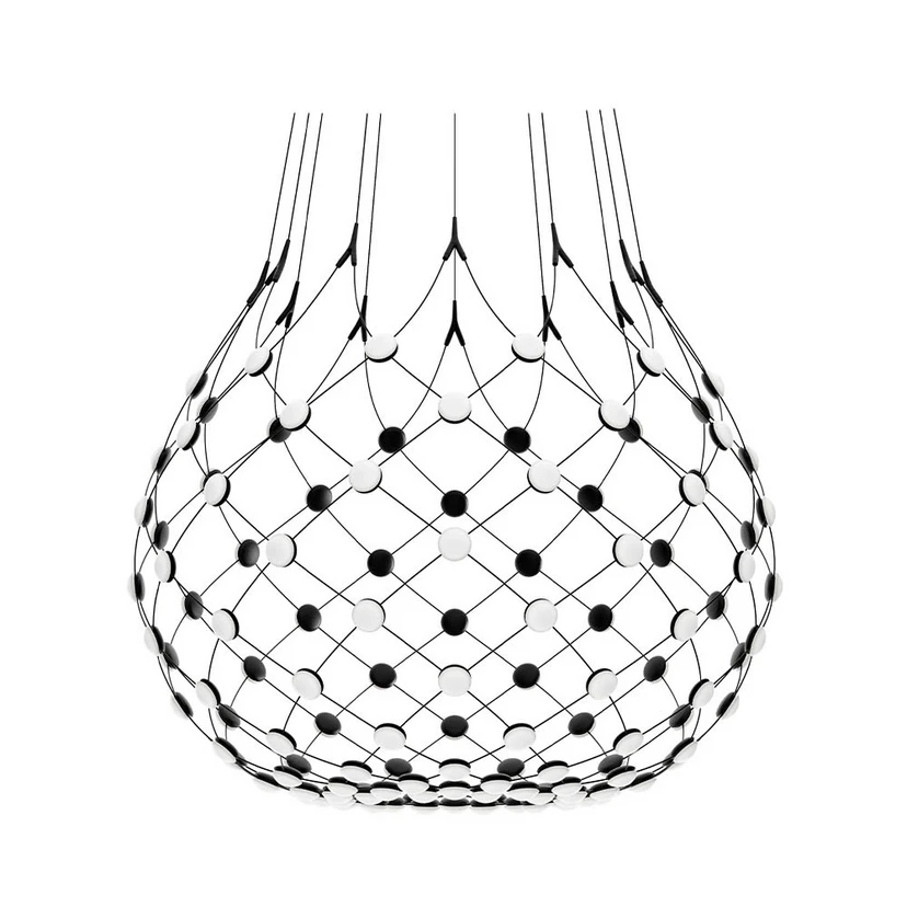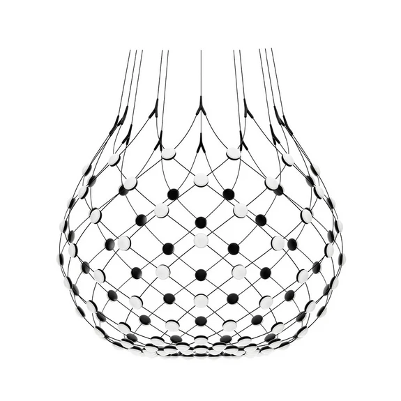Mesh Pendel Ø100xH90 Phase 4m Black fra Luceplan er en imponerende pendel, der kombinerer elegance og innovation. Denne sorte lampe, fremstillet af metal og polykarbonat, er designet til at være en dramatisk tilføjelse til ethvert interiør. Med en næsten gennemsigtig struktur af fleksible kabler og LED-lyskilder ved deres krydsninger, fokuserer den på at fremhæve lyset som det centrale element. Mesh pendlen fås i tre forskellige størrelser og fem længder, hvilket sikrer optimal lysfordeling i rummet. Med det trådløse kit kan du nemt styre lampen via Luceplan Mesh-appen, og den opdaterede Casambi-systemintegration giver mulighed for avanceret lysstyring. Denne pendel tilbyder mange belysningsscenarier, der kan tilpasses dine æstetiske og funktionelle behov. Oplev, hvordan denne innovative lampe kan transformere dit hjem med sin unikke lysoplevelse.