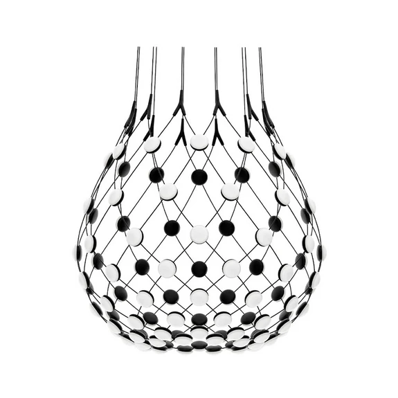 Mesh Pendel Ø80xH60 4m w/Wireless Kit Black fra Luceplan er en pendel, der kombinerer elegance og innovation. Denne lampe, fremstillet af metal og polykarbonat, har en sort finish, der passer perfekt ind i moderne interiører. Med en diameter på 80 cm og en højde på 60 cm, tilbyder den en dramatisk belysningseffekt, der skaber en unik atmosfære i ethvert rum. Den næsten gennemsigtige struktur, bestående af et netværk af fleksible kabler med LED-lyskilder, gør lyset til den sande hovedperson. Med det medfølgende Wireless Kit kan du nemt styre belysningen via Luceplan Mesh-appen, hvilket giver dig mulighed for at tilpasse lysscenarierne efter dine behov. Mesh-serien er også opdateret med Casambi-systemet, der integrerer lampen i et omfattende lysstyringssystem. Denne pendel er ideel til dem, der ønsker en kombination af æstetik og funktionalitet i deres hjem.