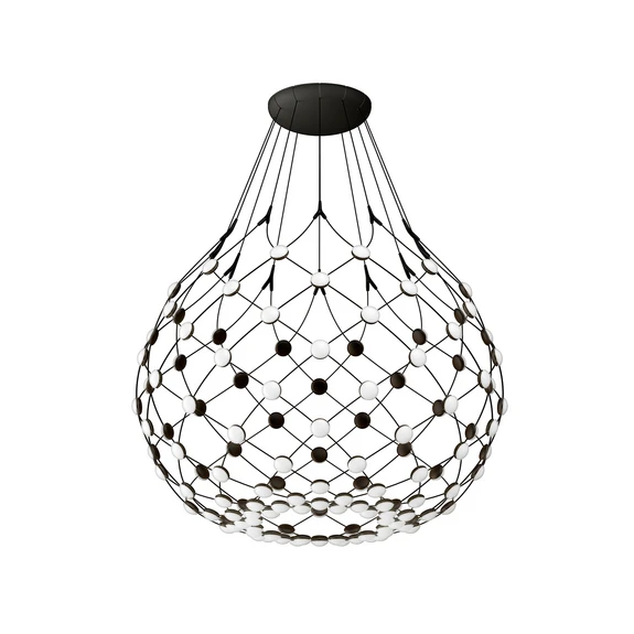 Mesh Pendel Ø80xH60 Phase 2m Black fra Luceplan er en imponerende pendel, der kombinerer elegance og innovation. Denne sorte lampe, fremstillet af metal og polykarbonat, er designet til at være en dramatisk tilføjelse til ethvert rum. Med en næsten gennemsigtig struktur af fleksible kabler og LED-kilder ved deres krydsninger, fokuserer den på at fremhæve lyset som det centrale element. Mesh pendlen kan styres via Luceplan Mesh appen, hvilket giver dig mulighed for at tilpasse belysningen efter dine behov. Den er også kompatibel med Casambi systemet, hvilket gør det muligt at integrere den i et omfattende lysstyringssystem. Med en diameter på 80 cm og en højde på 60 cm, sikrer denne lampe en optimal lysfordeling i rummet. Uanset om du ønsker at skabe en hyggelig atmosfære eller et funktionelt arbejdslys, er Mesh pendlen det perfekte valg til dit hjem.