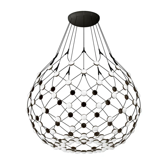 Mesh Pendel Ø80xH60 Phase 3m Black fra Luceplan er en imponerende pendel, der bringer et dramatisk og innovativt lysdesign ind i dit hjem. Denne lampe, fremstillet af metal og polykarbonat, har en elegant sort farve og måler Ø80xH60, hvilket gør den til et iøjnefaldende element i ethvert rum. Med sin næsten gennemsigtige struktur af fleksible kabler og LED-kilder, der er strategisk placeret ved krydsningerne, skaber den en unik lysoplevelse, hvor lyset er i fokus. Mesh lampen kan styres via Luceplan Mesh appen, hvilket giver dig mulighed for at tilpasse belysningen efter dine behov. Den er også kompatibel med Casambi systemet, hvilket gør det muligt at integrere den i et bredt kontrolsystem for belysningsdesign. Uanset om du ønsker en dramatisk effekt eller en subtil belysning, tilbyder denne pendel mange muligheder for personlig æstetik og funktionalitet.